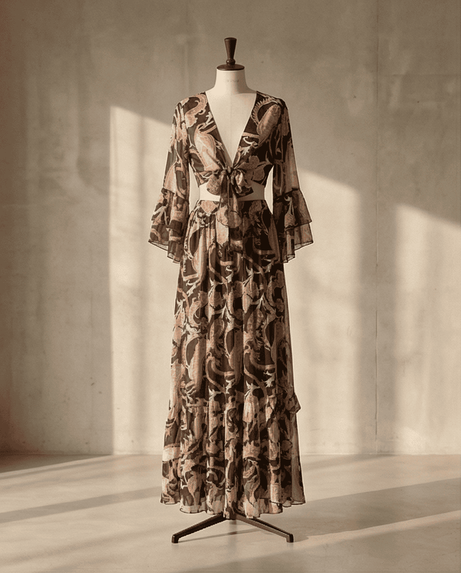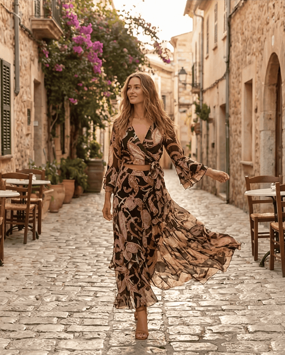 Ένα αέρινο και κομψό σετ που αποπνέει καλοκαιρινή φινέτσα. Αποτελείται από maxi φούστα με εσωτερική φόδρα και ιδιαίτερο τοπάκι με 3/4 μανίκι και δέσιμο μπροστά, που φοριέται με πολλούς τρόπους.