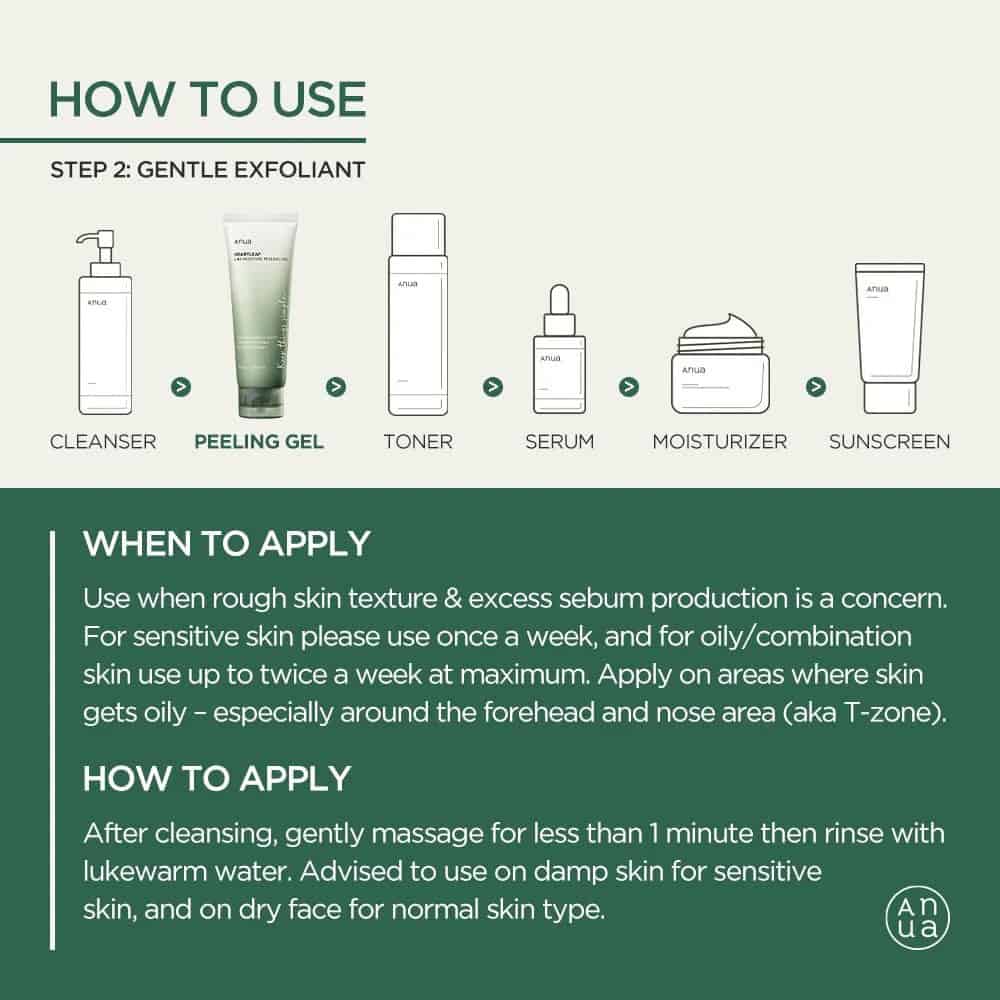 • Εφαρμογή: Απλώστε μια κατάλληλη ποσότητα του peeling gel σε καθαρό, στεγνό πρόσωπο. Κάντε απαλό μασάζ με κυκλικές κινήσεις για 1-2 λεπτά, αποφεύγοντας την περιοχή των ματιών. Ξεπλύνετε καλά με χλιαρό νερό.