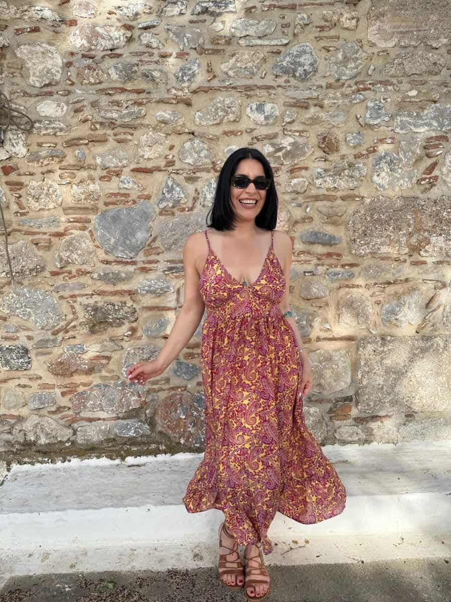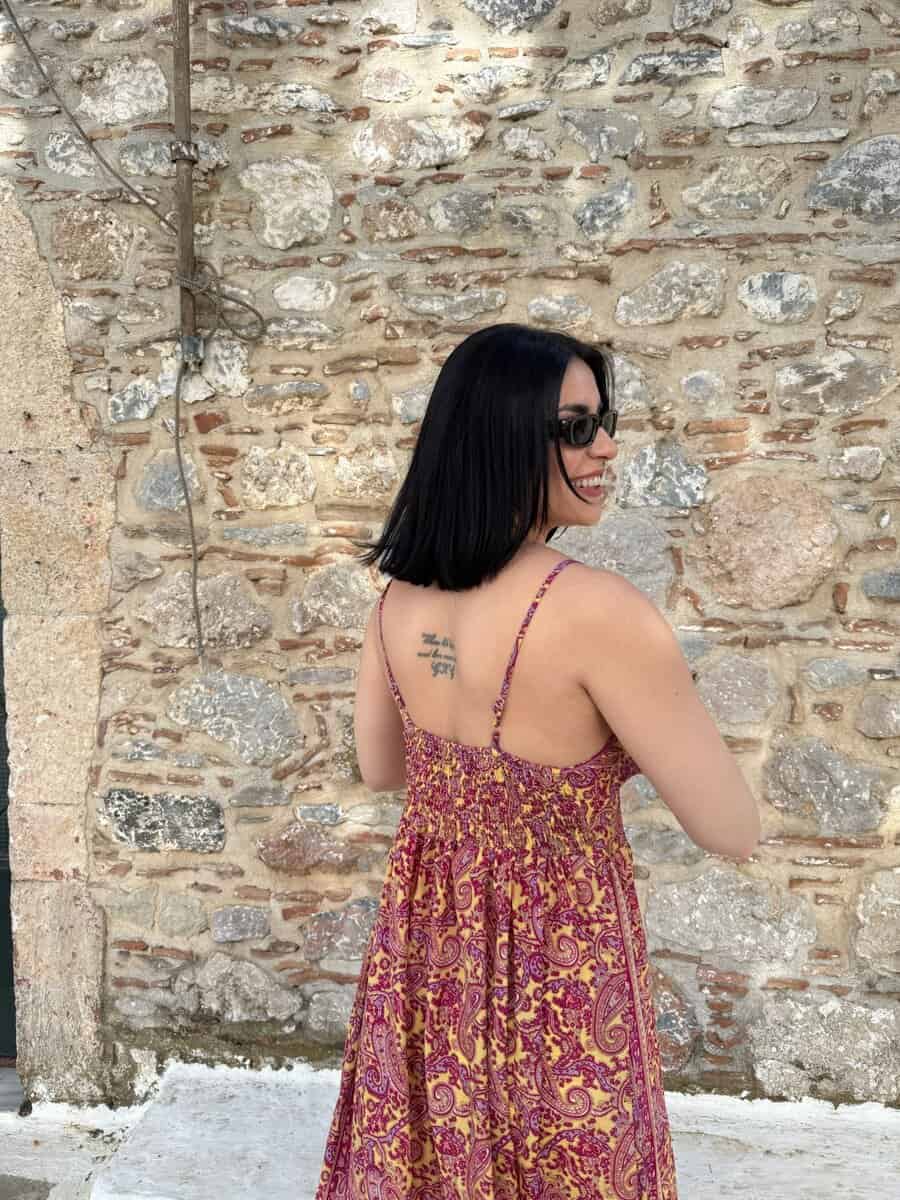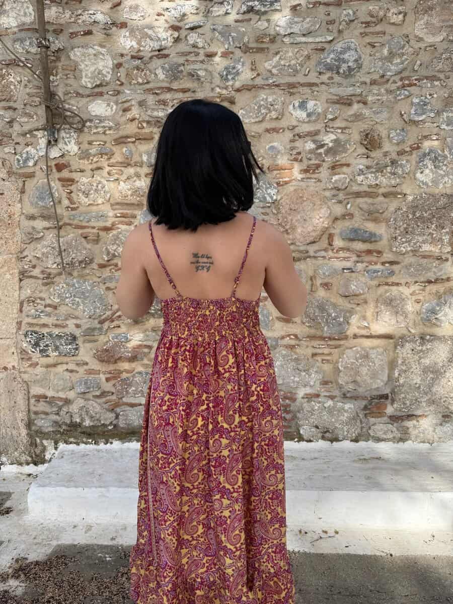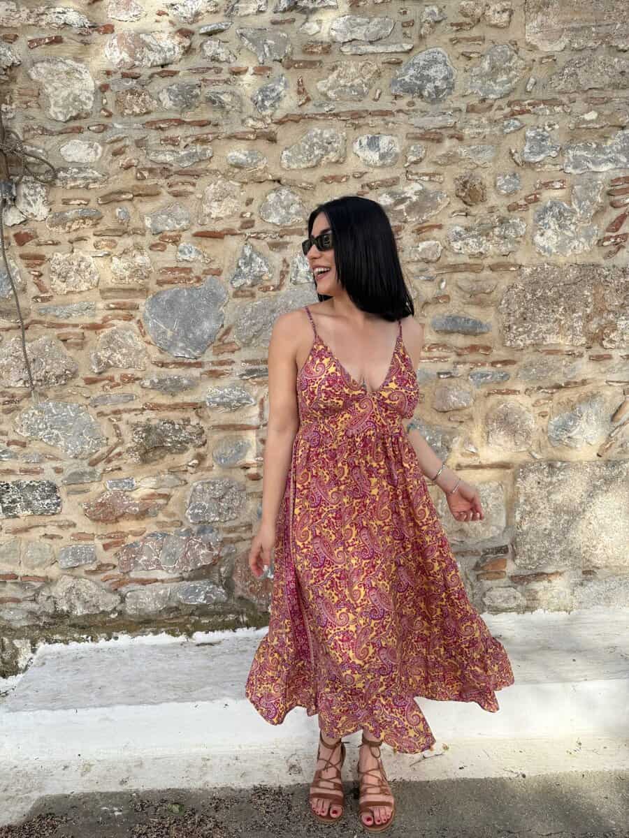 Ανάλαφρο, αέρινο και κομψό, με εντυπωσιακό paisley μοτίβο σε ζεστές αποχρώσεις, αυτό το μάξι φόρεμα αγκαλιάζει το σώμα και αναδεικνύει τη θηλυκότητα. Ιδανικό για νησιώτικες βόλτες, ρομαντικά ηλιοβασιλέματα ή χαλαρές εξόδους στην πόλη.