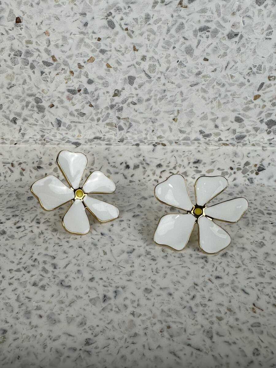 Ατσάλινα σκουλαρίκια σε σχήμα λουλουδιού.Λευκά με χρυσές λεπτομέρειες, κομψά και φρέσκα, δίνουν διακριτική λάμψη σε κάθε εμφάνιση.