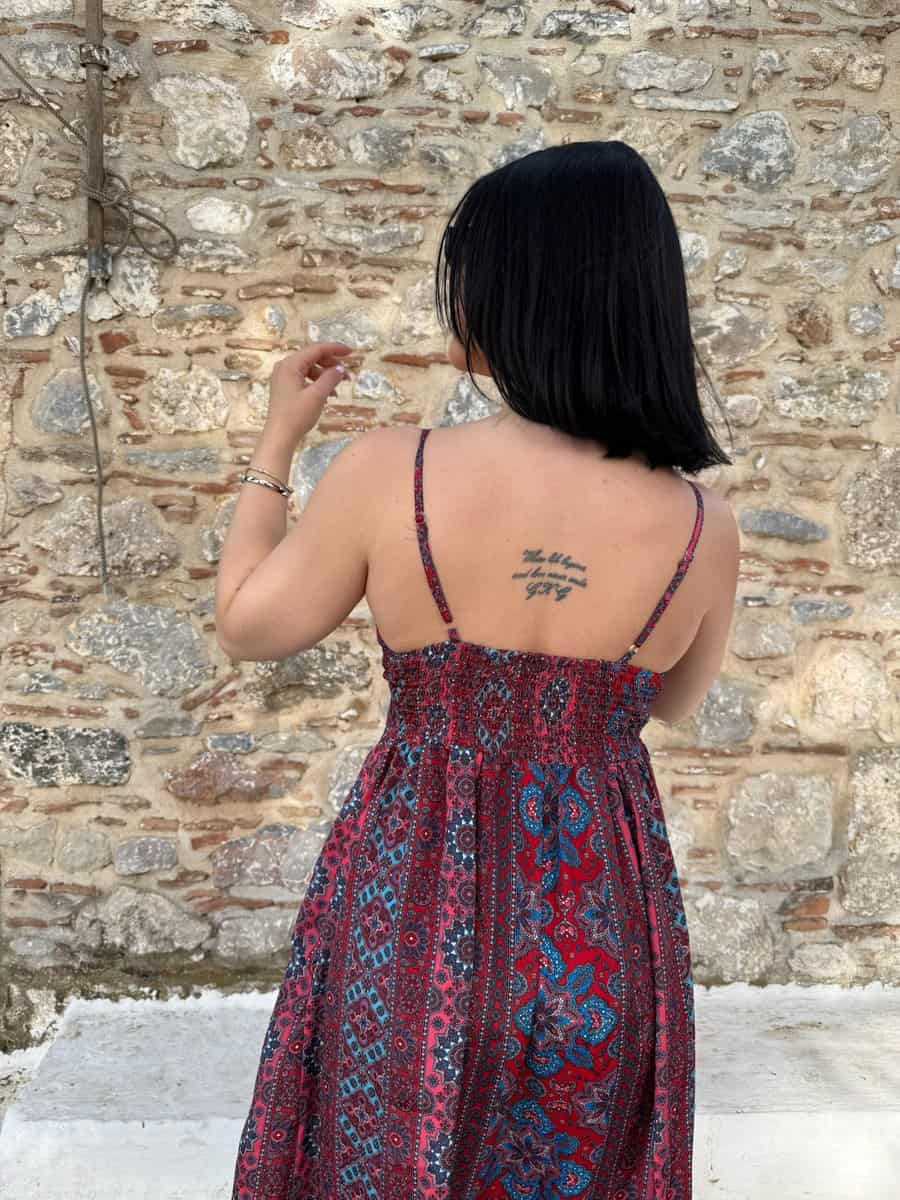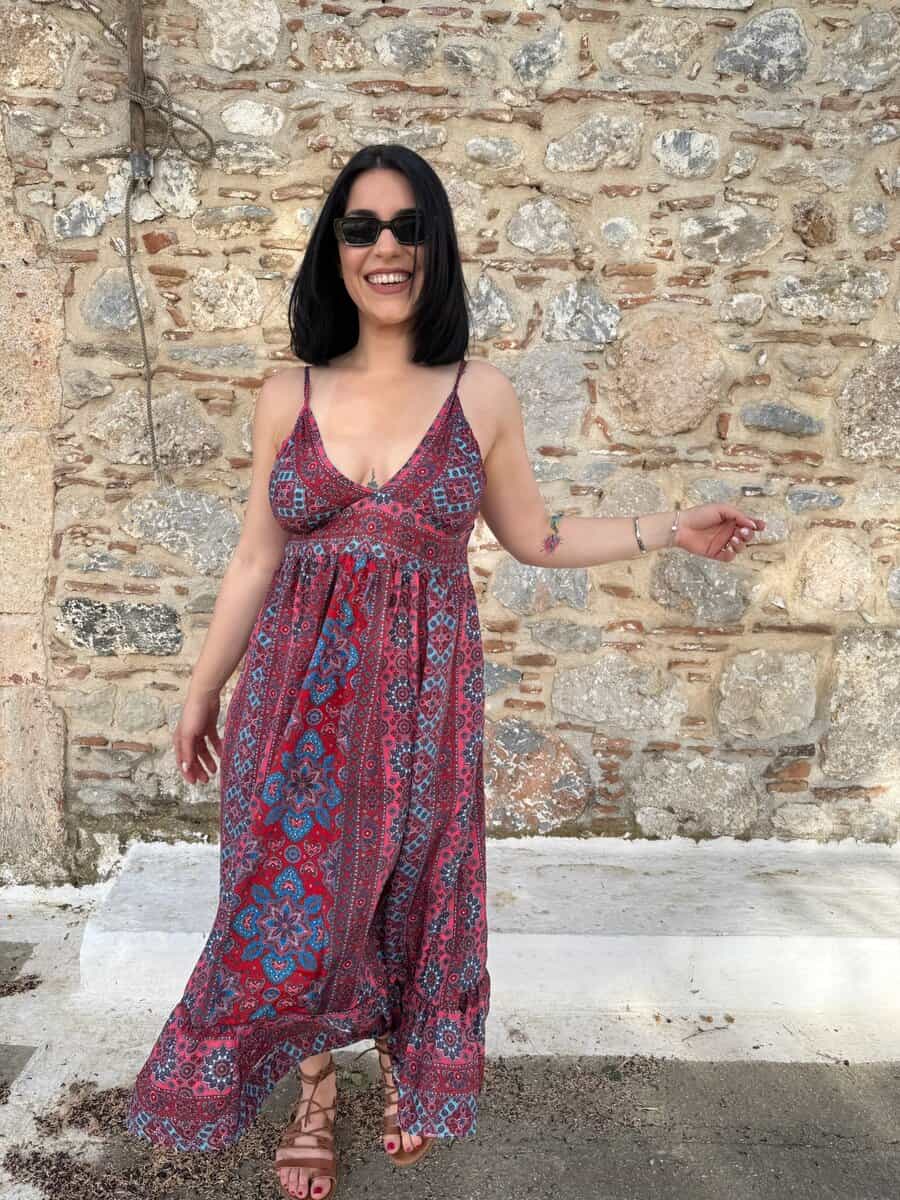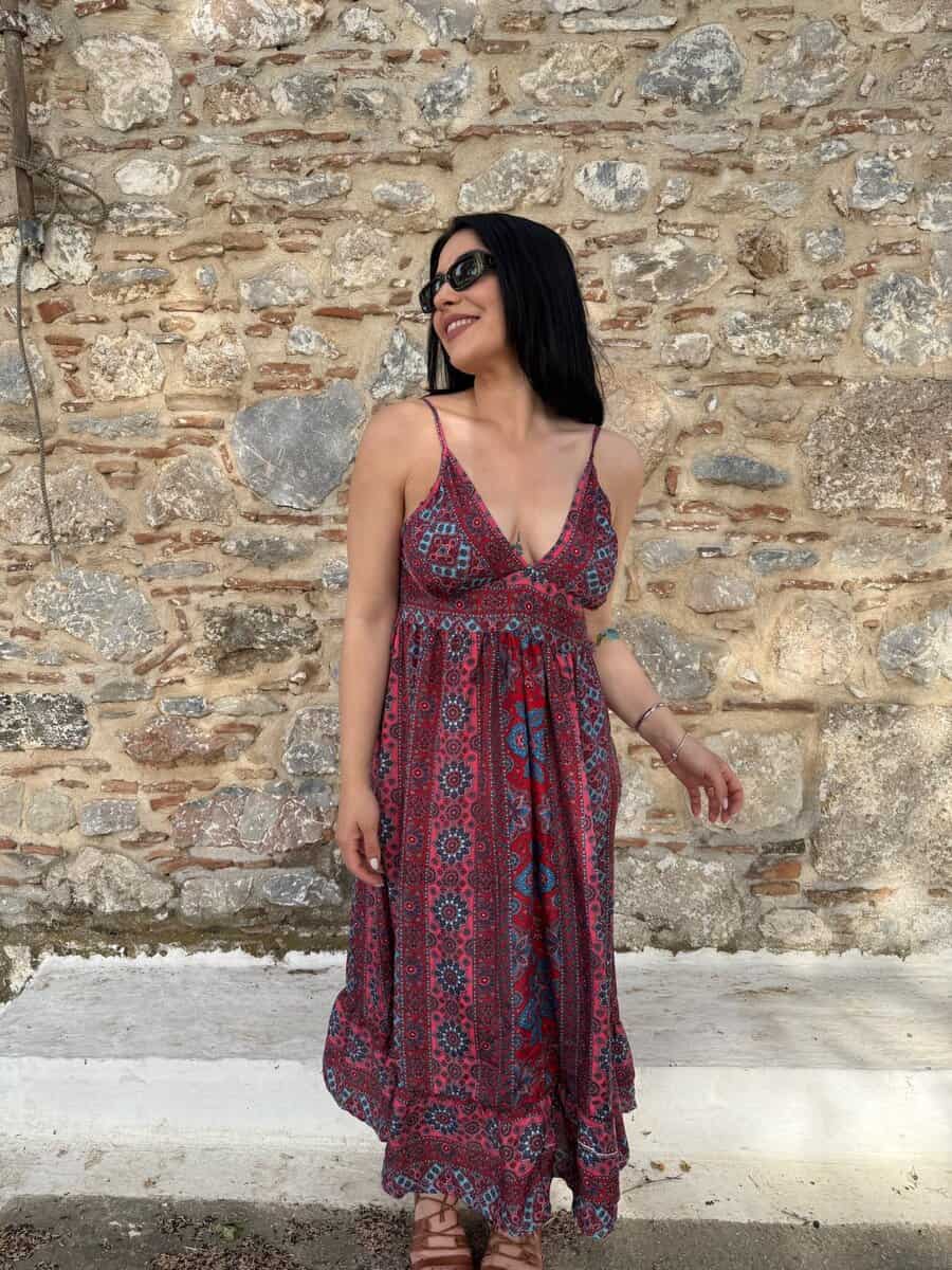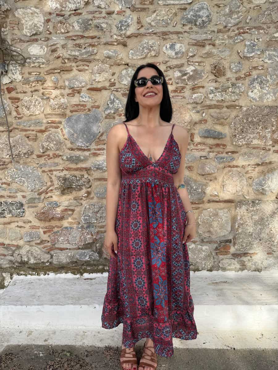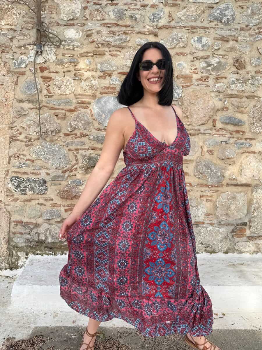 Αφήστε το καλοκαίρι να σας ταξιδέψει με αυτό το αέρινο boho φόρεμα, εμπνευσμένο από τα χρώματα και τους ρυθμούς του Αιγαίου. Με μακρύ μήκος και παιχνιδιάρικο εμπριμέ σχέδιο σε αποχρώσεις του κόκκινου και του μπλε, αυτό το φόρεμα είναι ιδανικό για ανέμελες βόλτες, νησιώτικες εξορμήσεις και ηλιόλουστες μέρες.