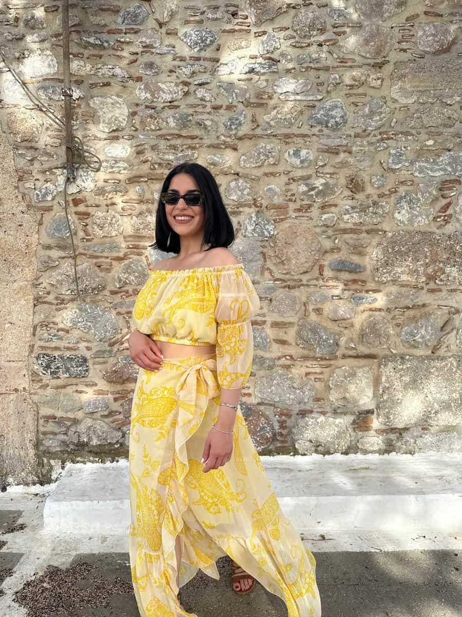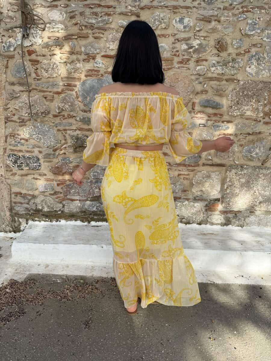 Το Lemon Glow Set είναι η επιτομή της καλοκαιρινής ανεμελιάς. Με έντονο κίτρινο print και αέρινη κίνηση, αυτό το σετ με έξω ώμους και εντυπωσιακή φούστα σε αέρινη γραμμή θα γίνει το αγαπημένο σου κομμάτι για διακοπές, νησιά και δροσερές απογευματινές εμφανίσεις.Η φούστα διαθέτει λάστιχο στην μέση και φόδρα. Καλύπτει S/M-M/L. ( ελαστικότητα )