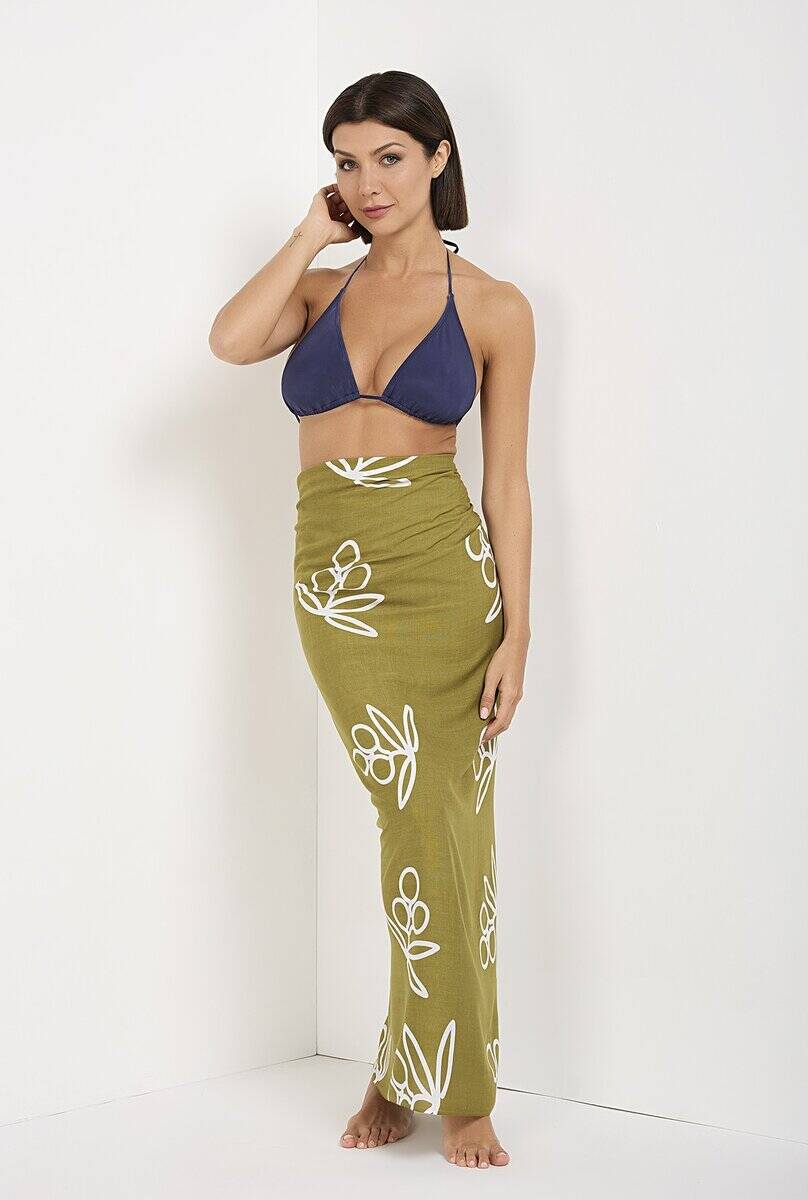 Φέρε την αύρα του ελληνικού καλοκαιριού στο στυλ σου με το παρεό Oliva. Σε βαθύ λαδί χρώμα με μίνιμαλ λευκά σχέδια εμπνευσμένα από φύλλα και ελιές, αυτό το κομμάτι αποπνέει απλότητα, κομψότητα και φυσική ομορφιά.