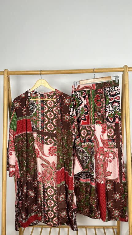 Με έντονα prints σε patchwork σύνθεση και φτιαγμένο από μαλακή, δροσερή βισκόζη, το σετ περιλαμβάνει πουκαμίσα με φαρδιά γραμμή και ασορτί παντελόνι με λάστιχο στη μέση για τέλεια εφαρμογή.