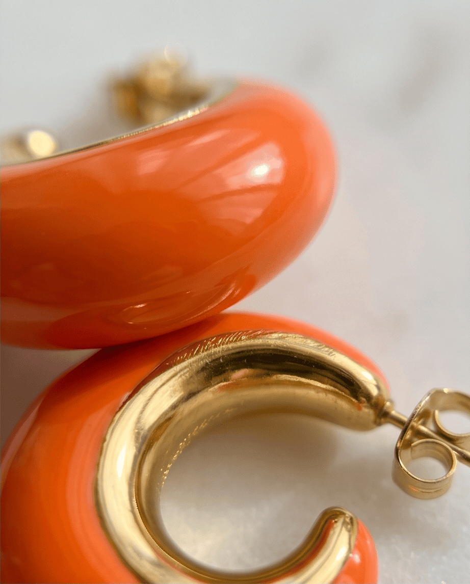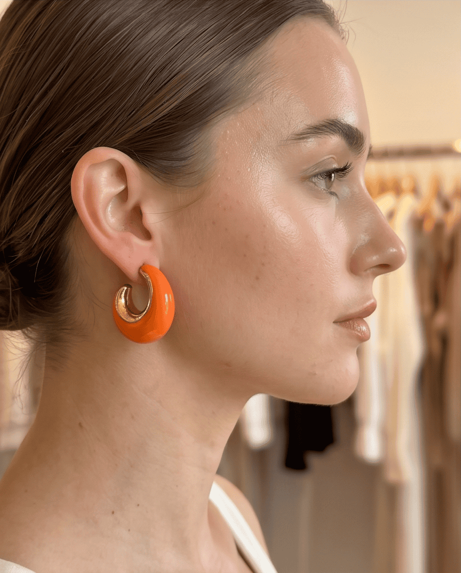 Μοντέρνοι κρίκοι σε έντονο πορτοκαλί με χρυσή λεπτομέρεια. Ελαφριά και άνετα, ιδανικά για καθημερινό αλλά και πιο ιδιαίτερο στυλ.